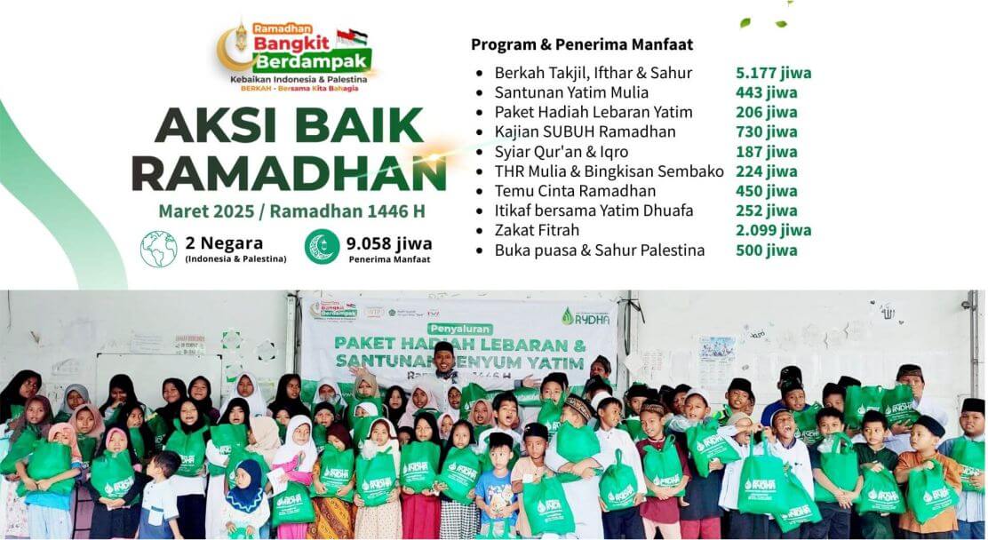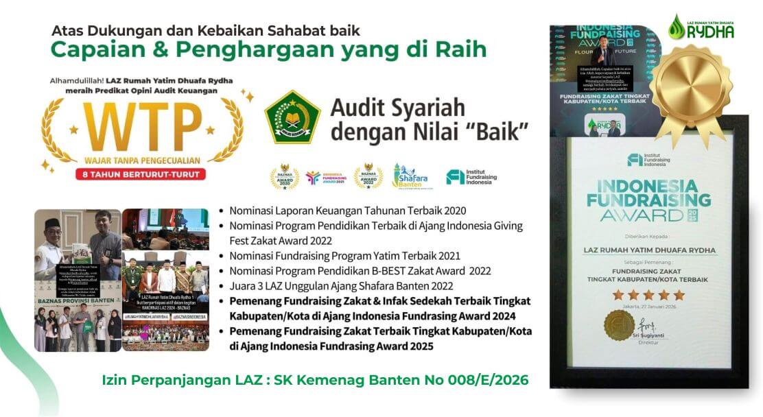 Jazakumullah khoiron atas kepercayaan anda kepada kami. Alhamdulillah, di tahun 2022 LAZ RYDHA telah menyalurkan amanah kepada 21.021 Penerima Manfaat. Telah teraudit Syariah dari Kementrian Agama Republik Indonesia (KEMENAG RI) dengan Nilai "Baik", Juara 3 LAZ unggulan BANTEN, Menjadi Nominasi program Yatim Terbaik di ajang Indonesia Fundraising Award dan Nominasi Laporan Tahunan Terbaik BAZNAS.