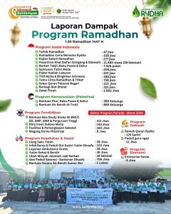 Berbagai program kebaikan telah dilaksanakan sepanjang bulan suci Ramadhan, di antaranya Tarhib ramadha, Ramadhan Ceria Bersama Rydha, Kajian Subuh Ramadhan, Pesantren Kilat (Safari Dongeng & Dakwah, Berkah Takjil, Buka Puasa dan Sahur, Santunan Yatim Mulia, Paket Hadiah Lebaran, Temu Cinta Ramadhan & I’tikaf, Sebak Qur’an Pelosok Negeri, Berbagi alat sholat, dan Zakat Firah